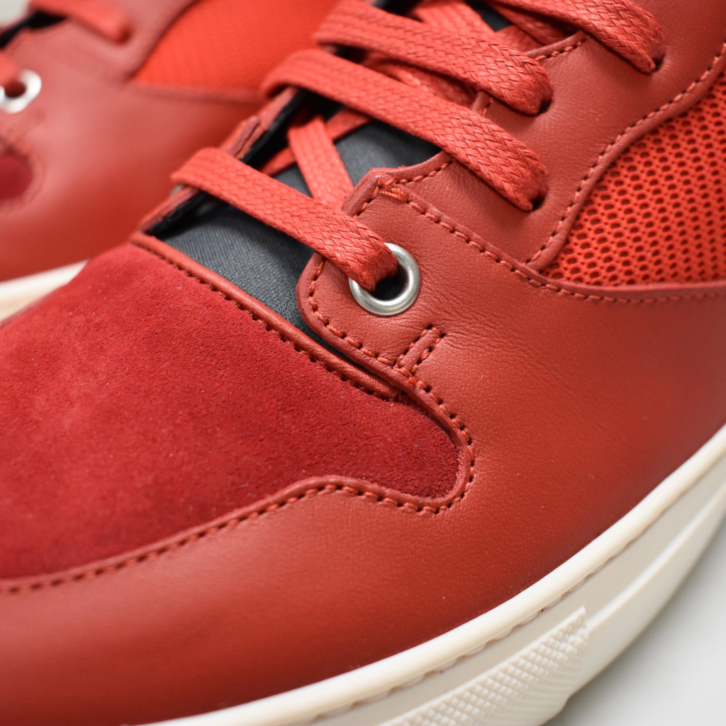 - Red calfskin leather upper with suede and woven mesh accents