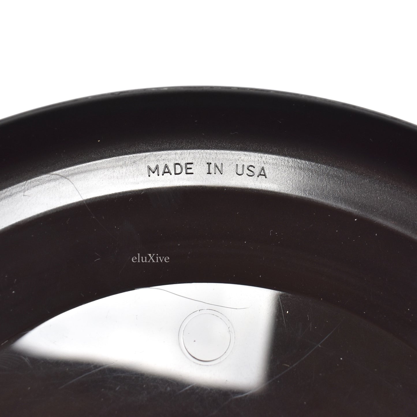 - Black plastic frisbee with printed 'A Bathing Ape Busy Works' logo in center
