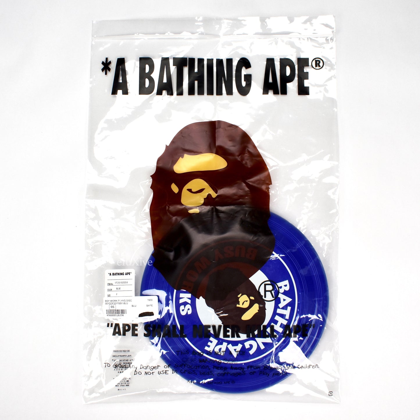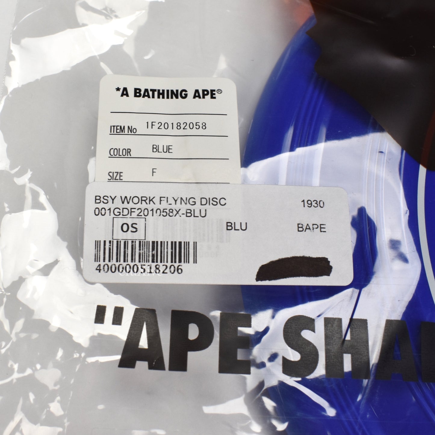 - Blue plastic frisbee with printed 'A Bathing Ape Busy Works' logo in center