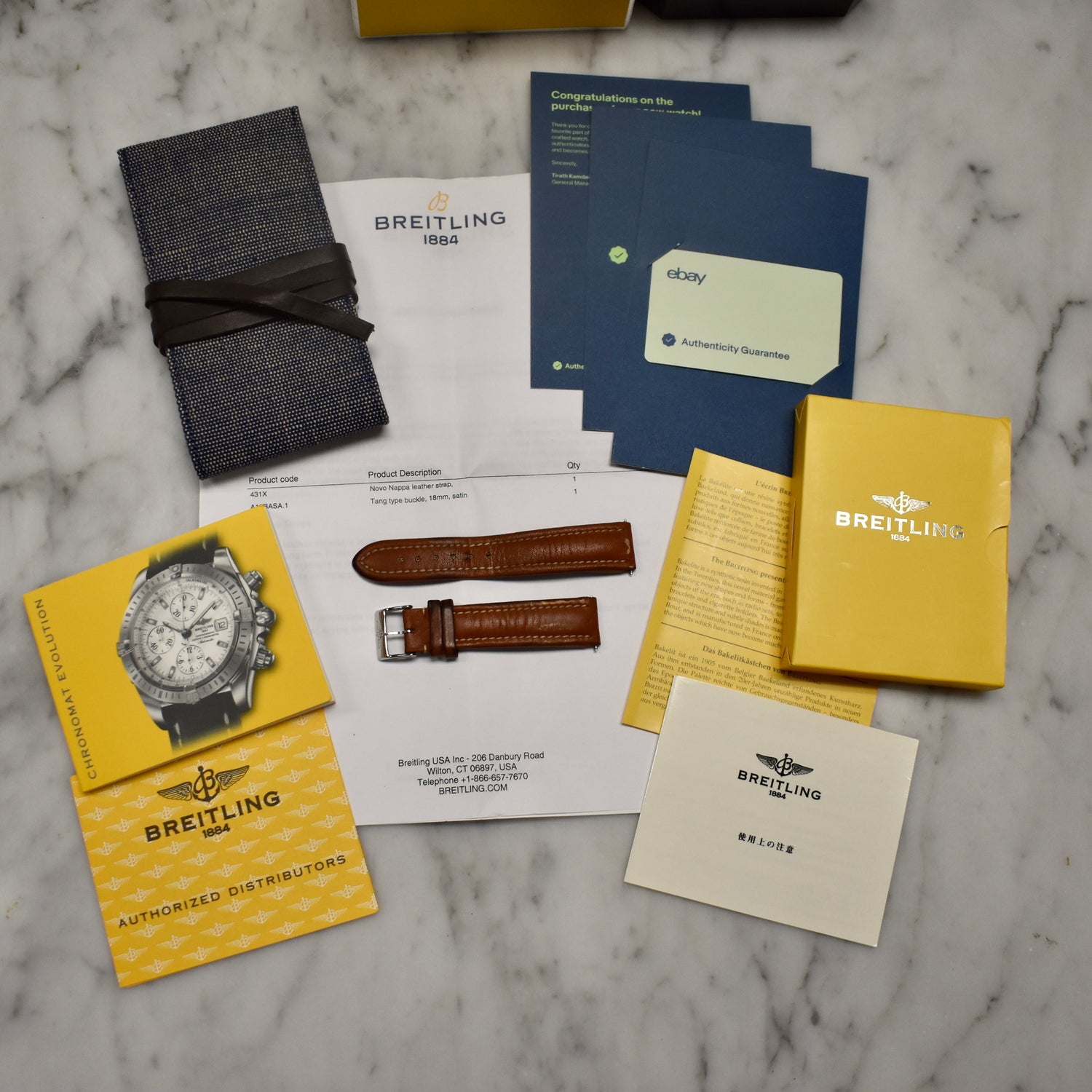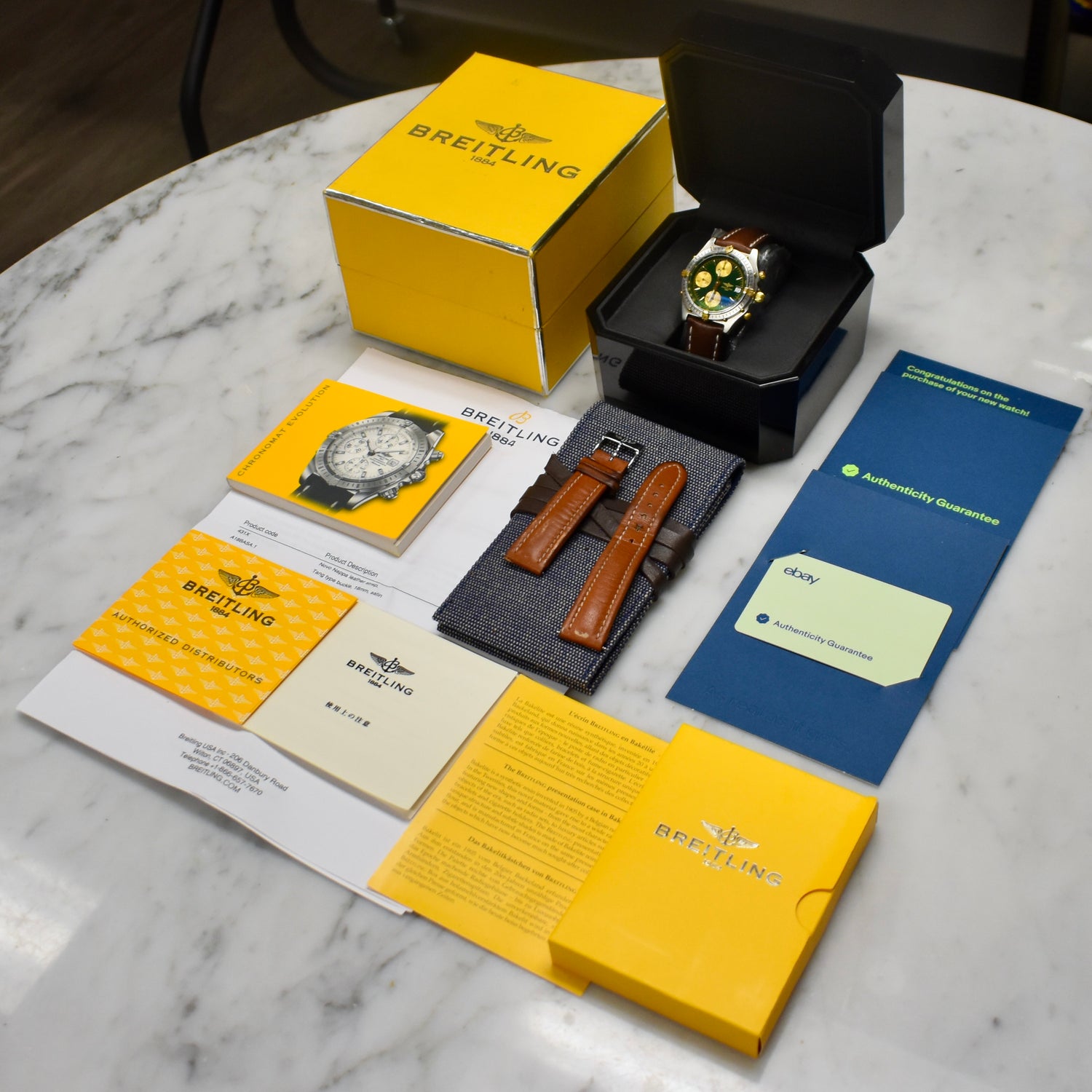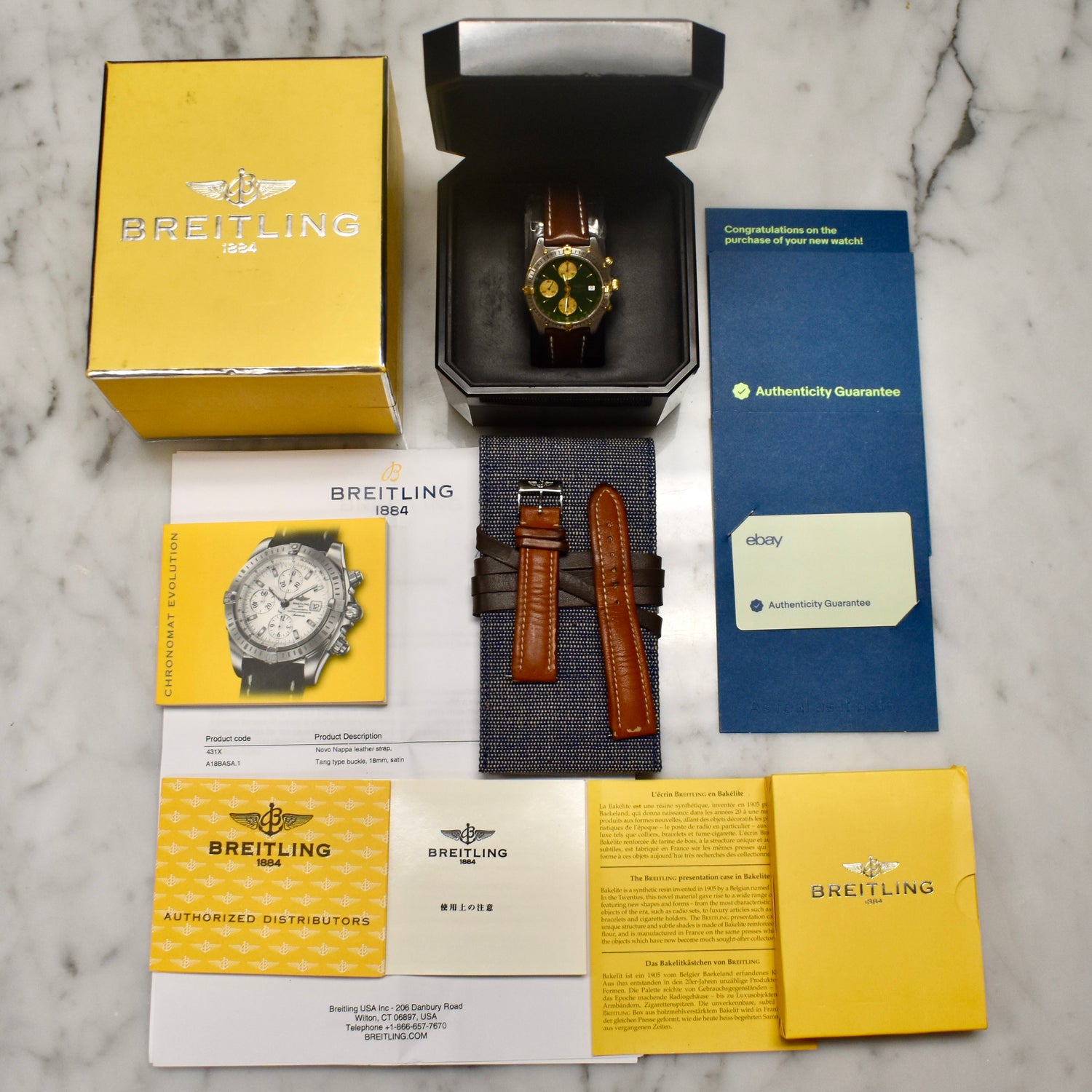 - Includes original box, original Bakelite case, eBay Authenticity Guarantee paperwork, 2024 receipt from Breitling for the new strap, replacement Breitling instruction manual (from later Chronomat Evolution), Breitling cloth travel pouch, and original used Breitling strap and buckle.