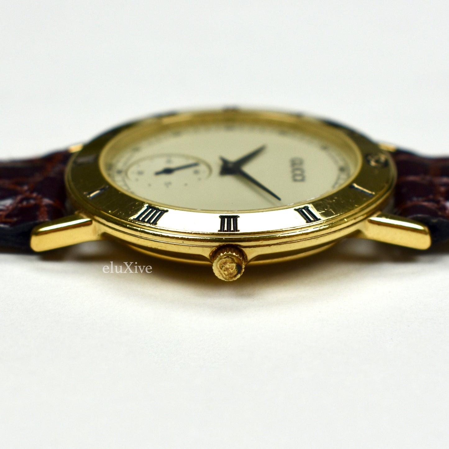 - 18K gold-plated stainless steel case with engraved roman numerals on bezel