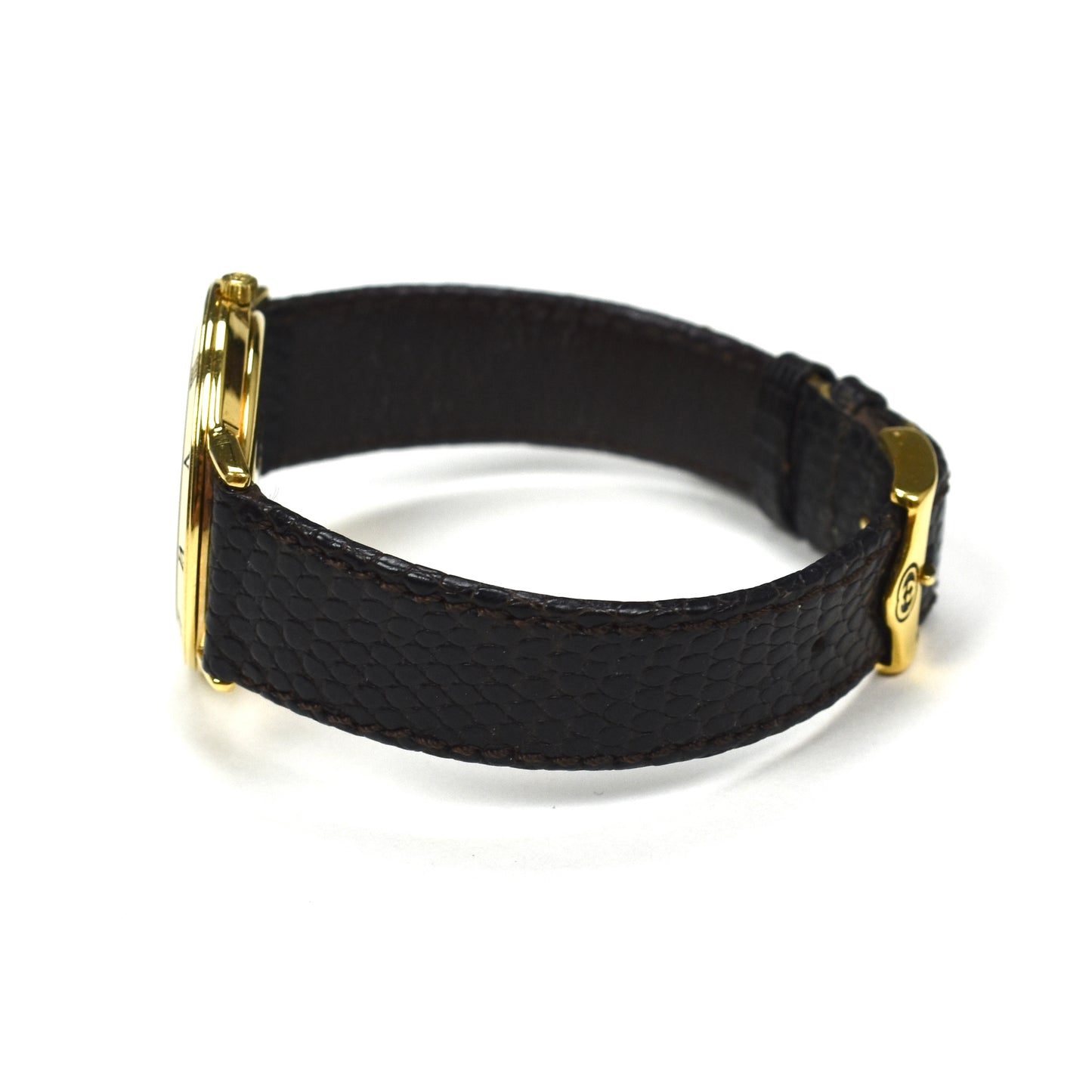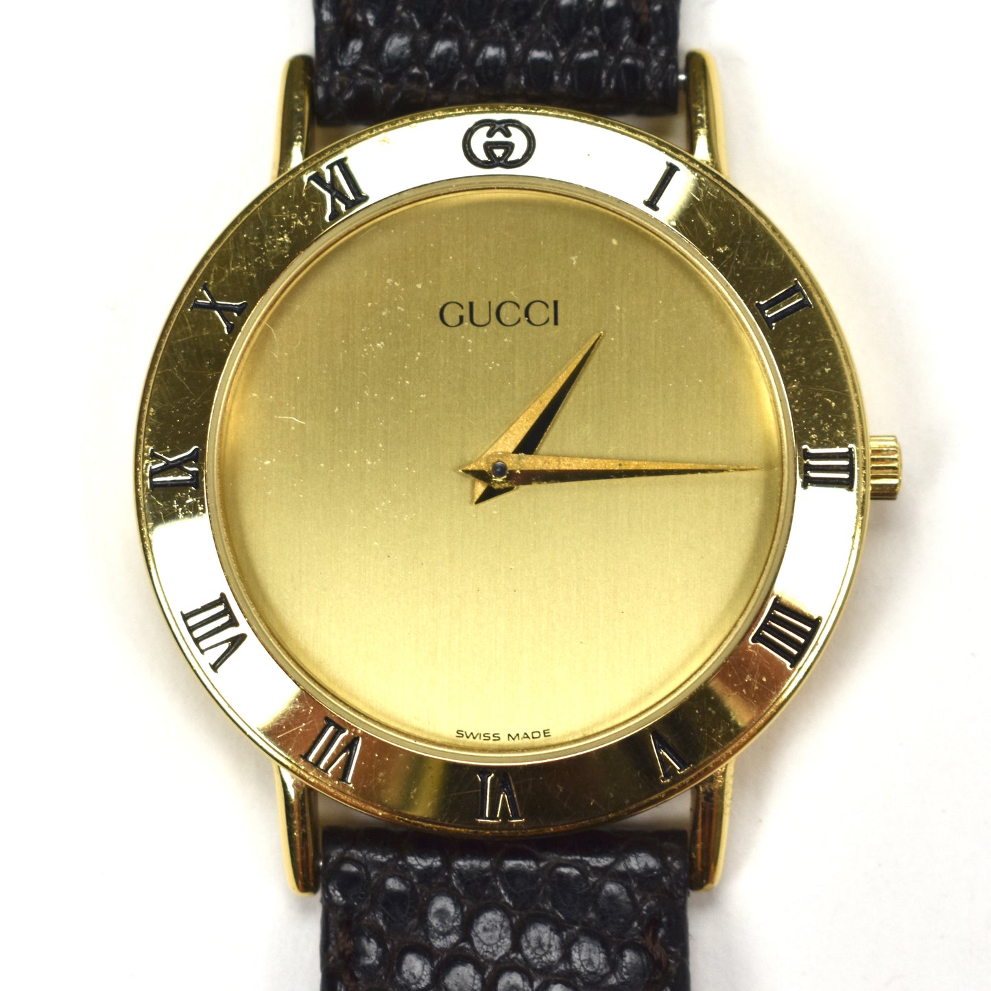 - 18K gold-plated stainless steel case with engraved roman numerals