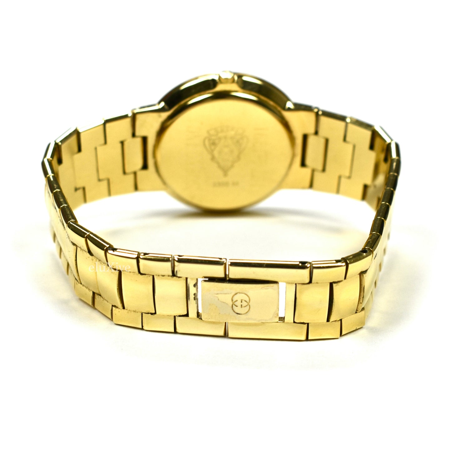 - 18K gold-plated stainless steel case with engraved roman numerals on bezel