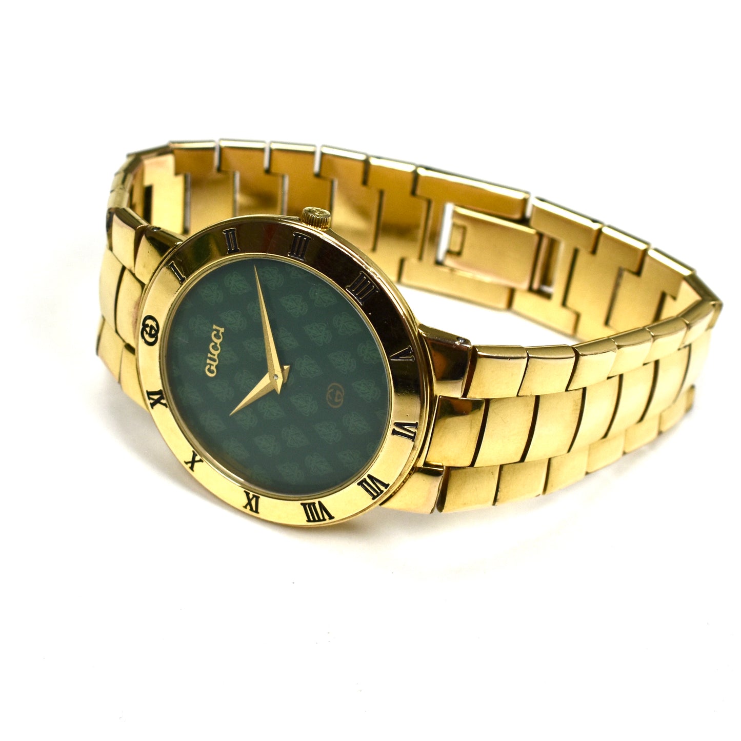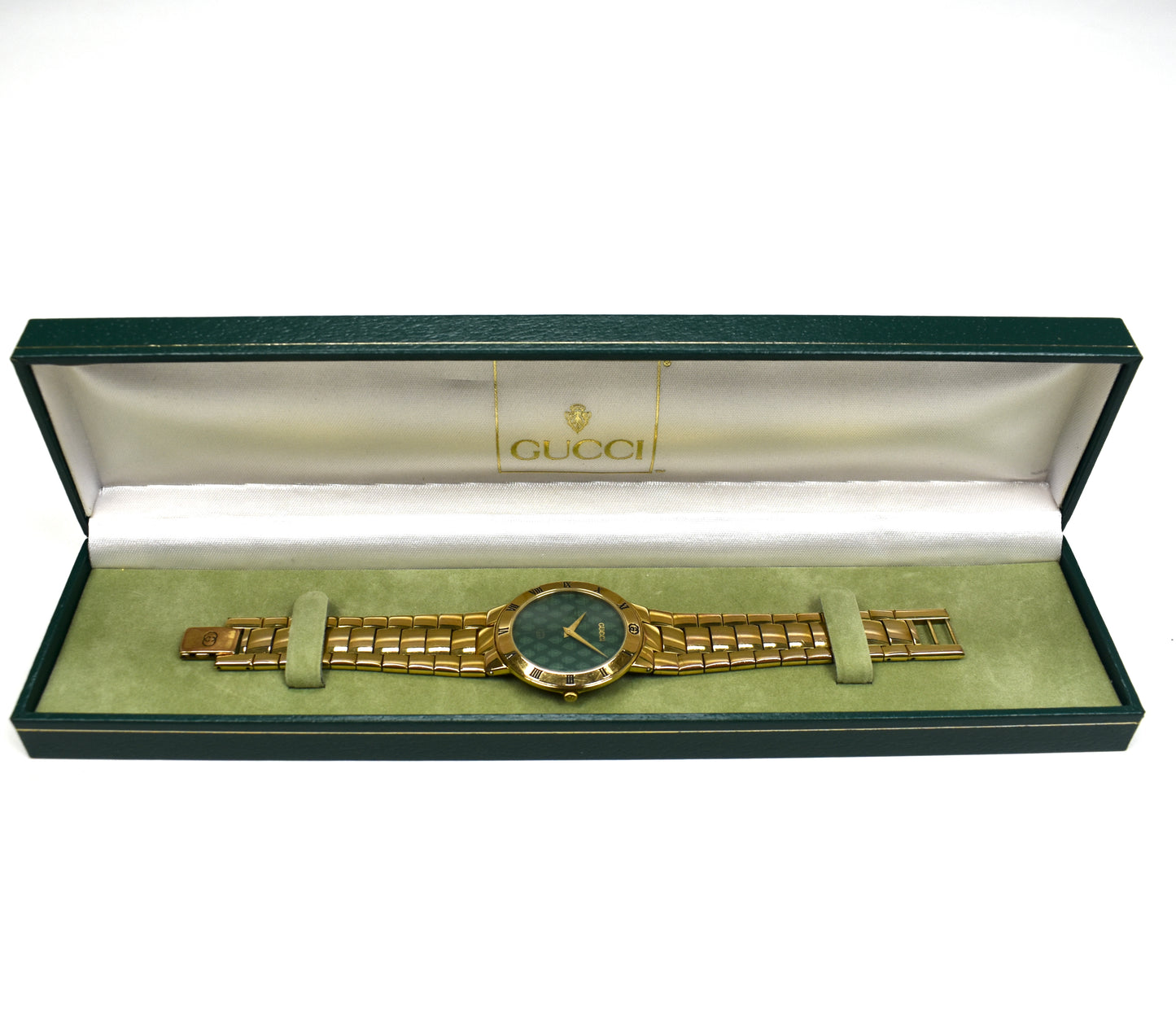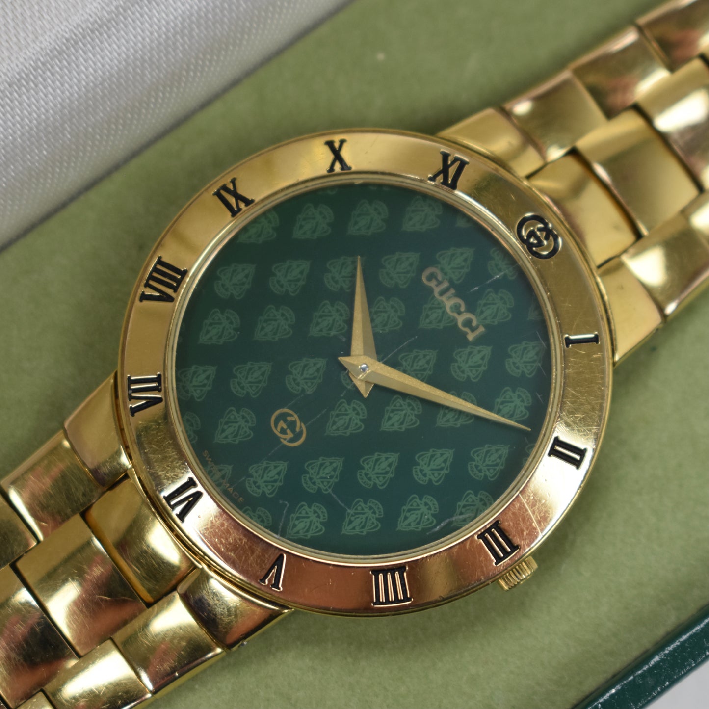 - Extremely rare signature green crest / knight printed logo dial with raised 'GUCCI' lettering