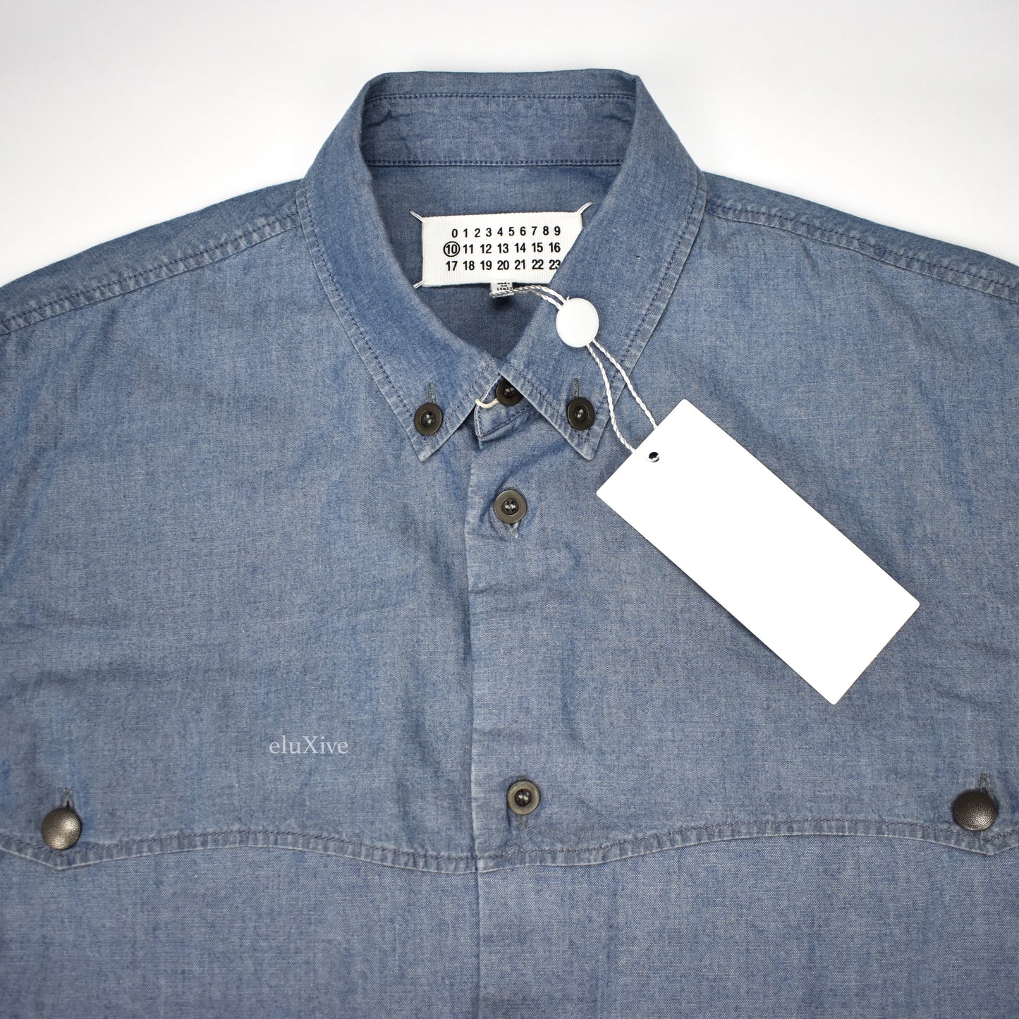 - Button down collar, barrel cuffs, 2 front pockets hidden under flaps, silver dotted detail on front pocket buttons, metal buttons