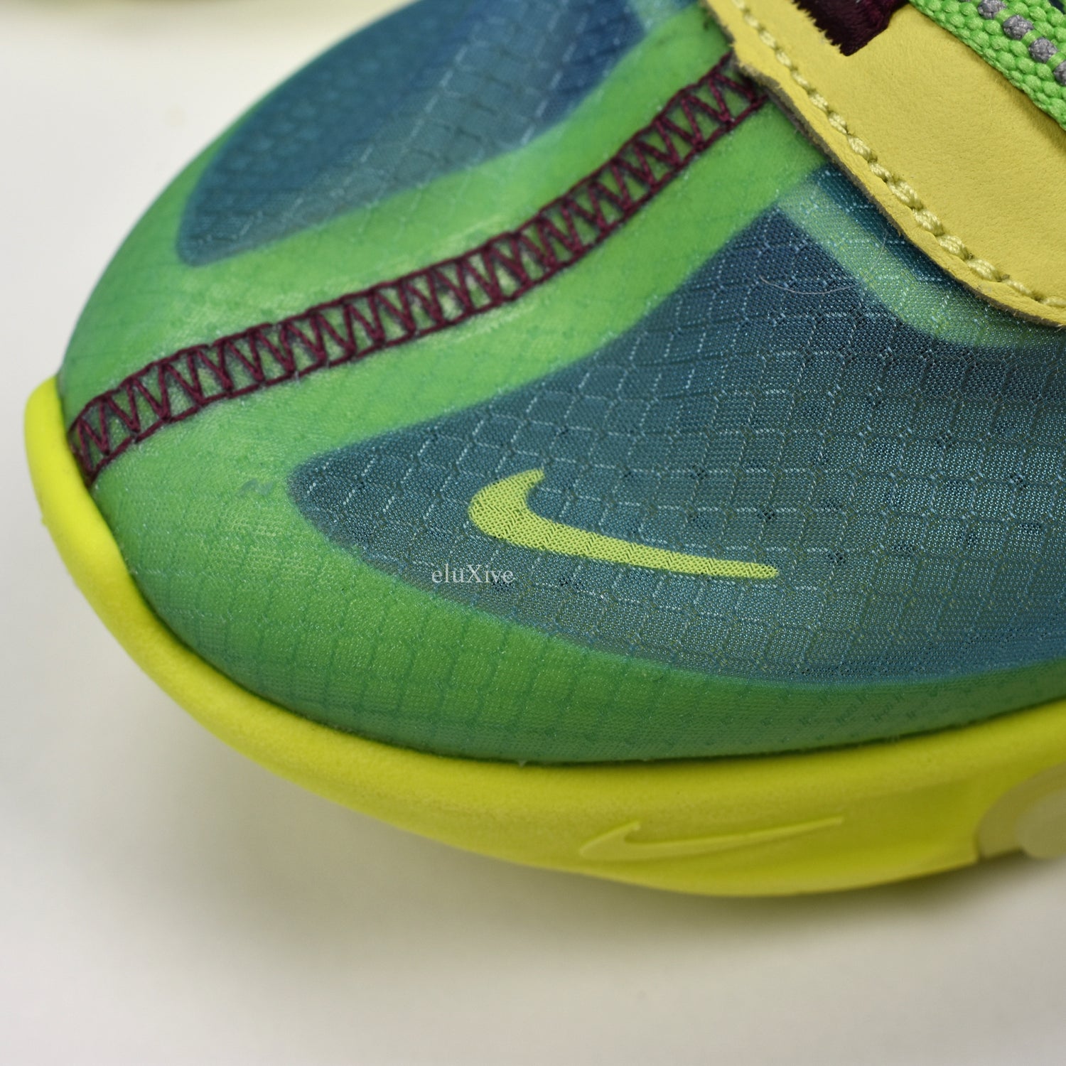 - Translucent blue, green, and yellow upper