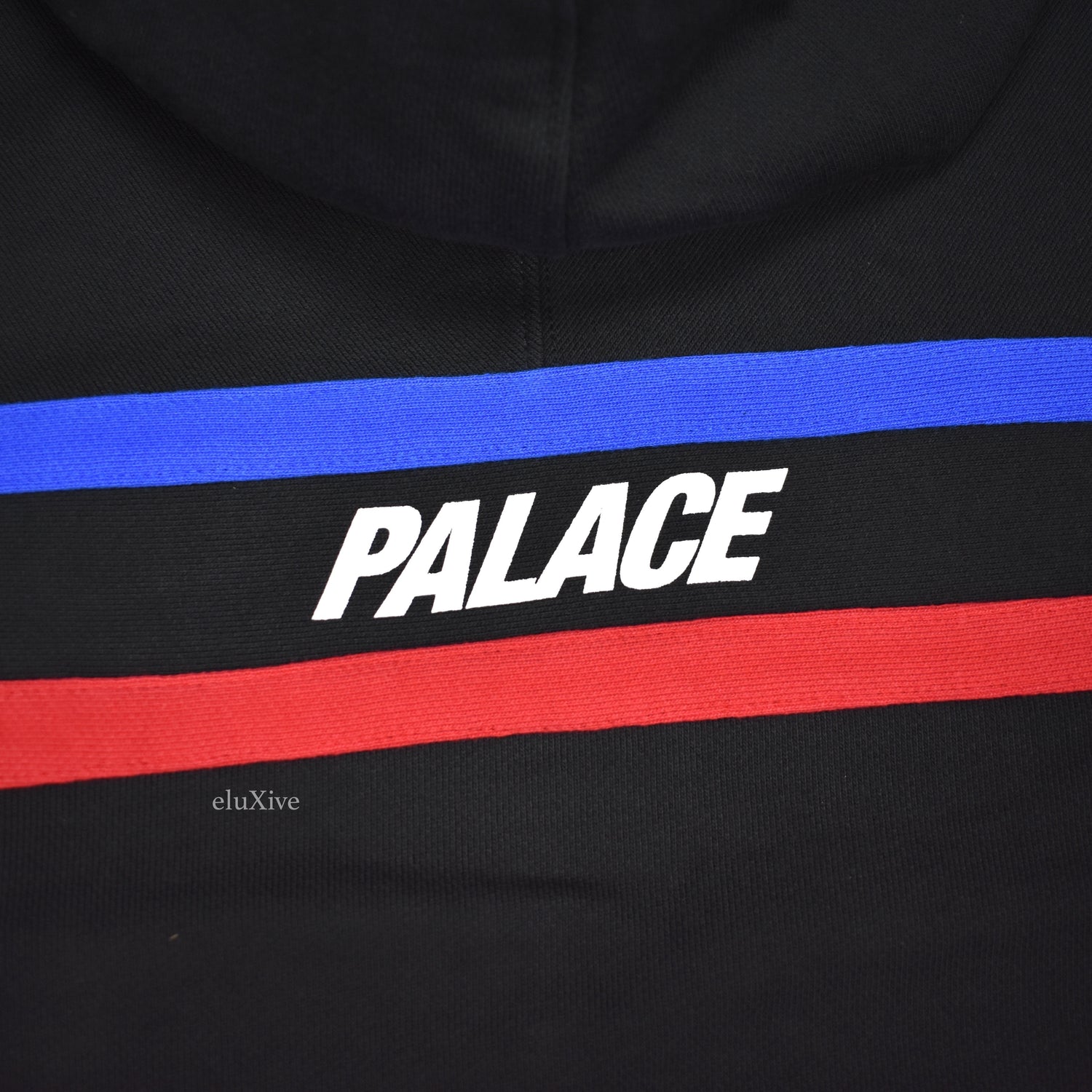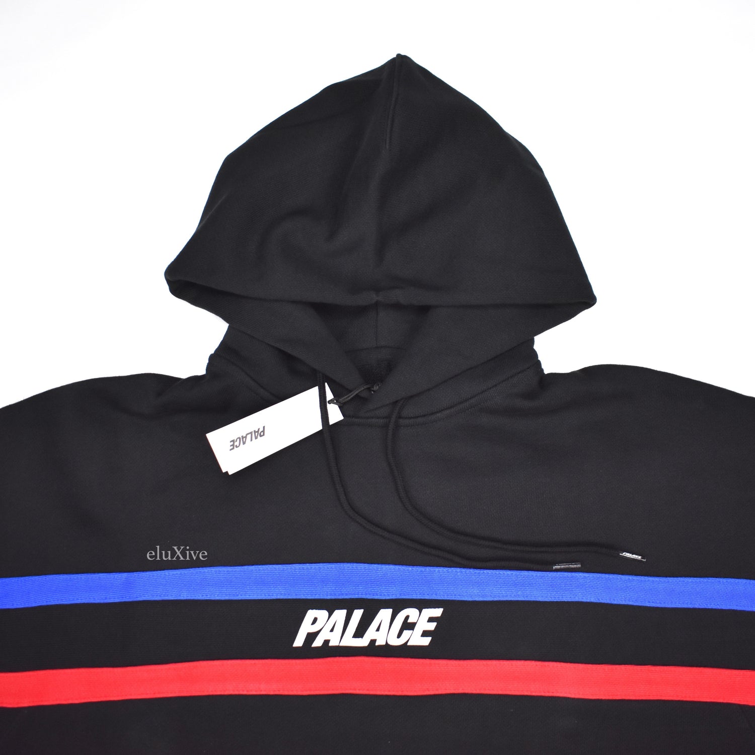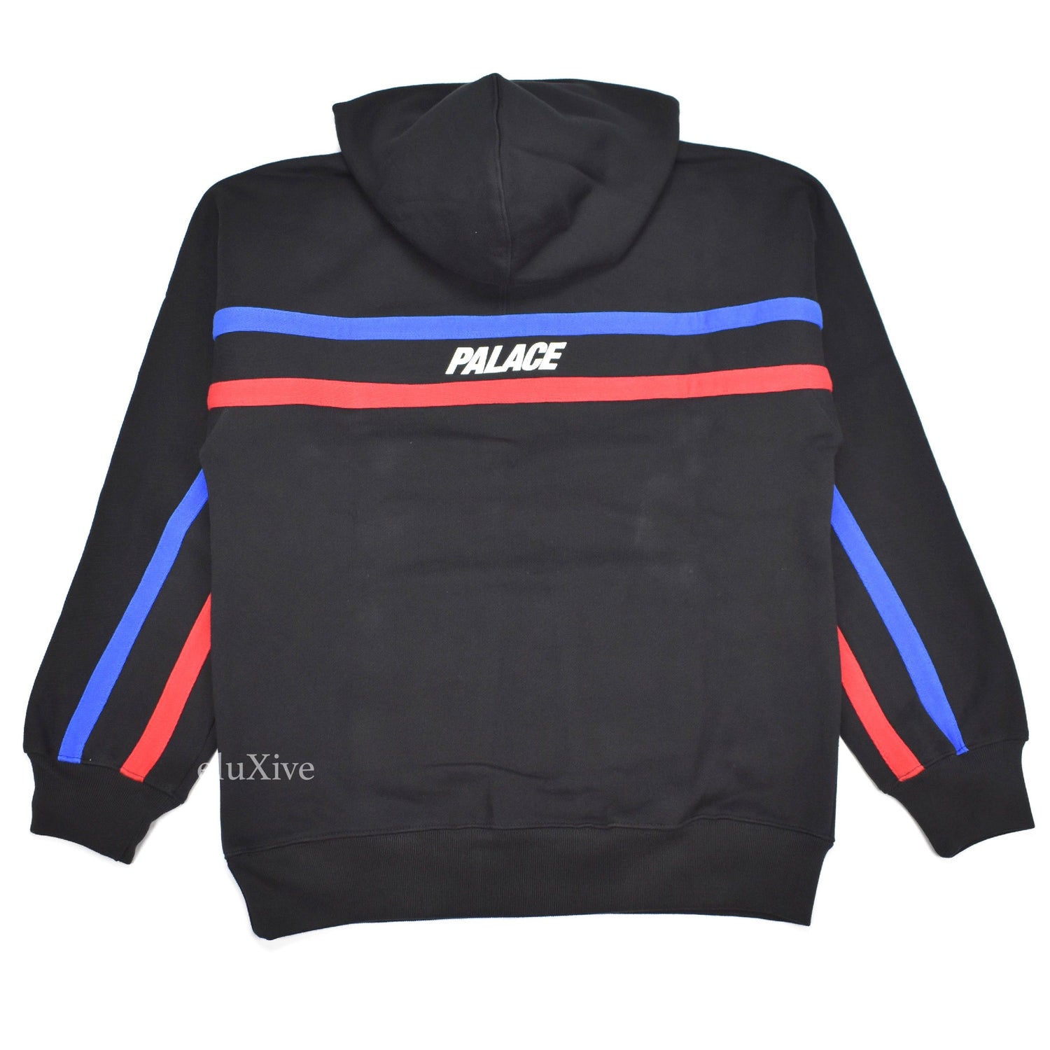 - Red and blue stripes stitched from left cuff, across chest, to right cuff on front and back of hoodie