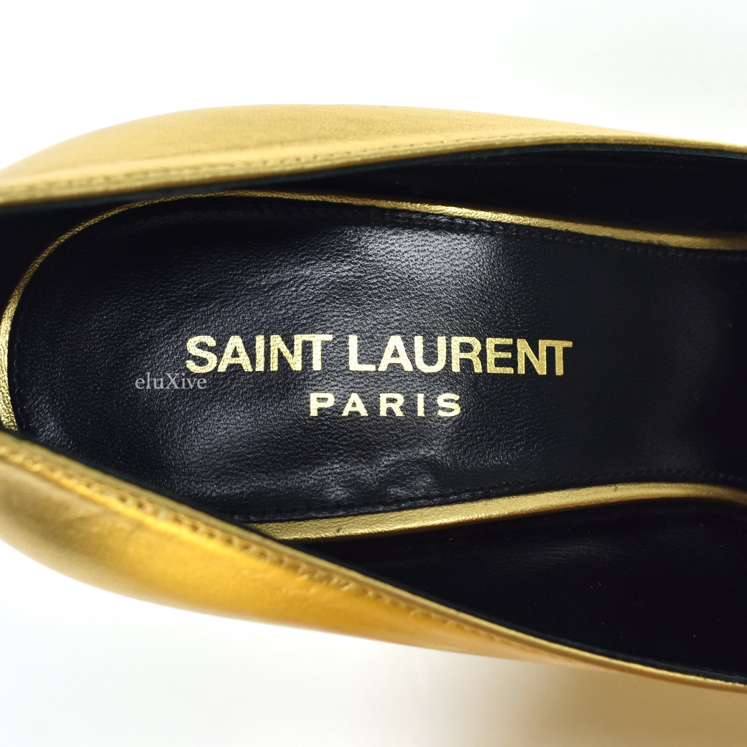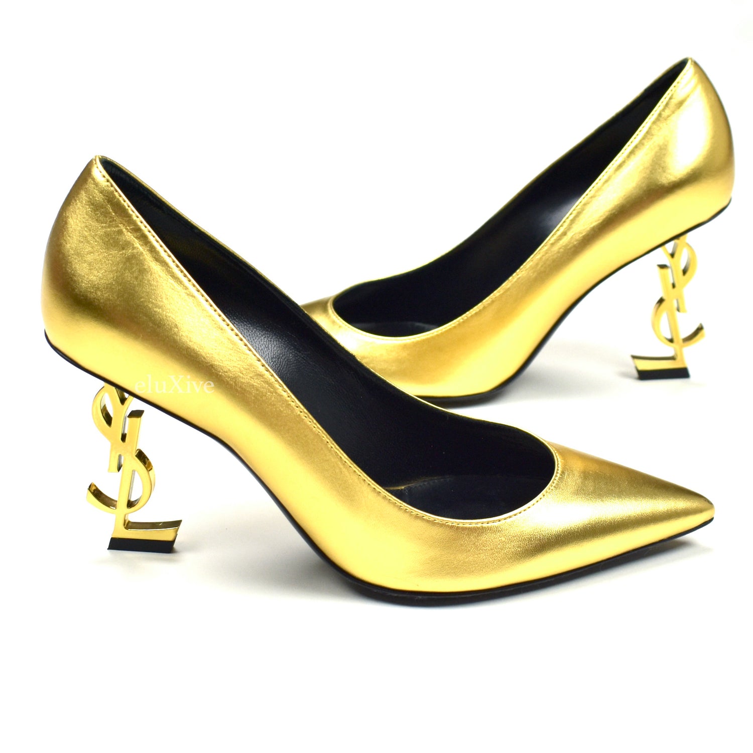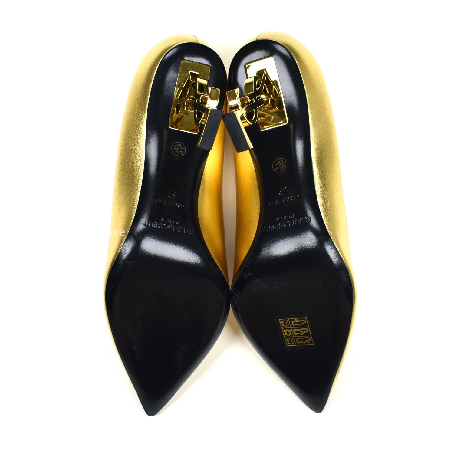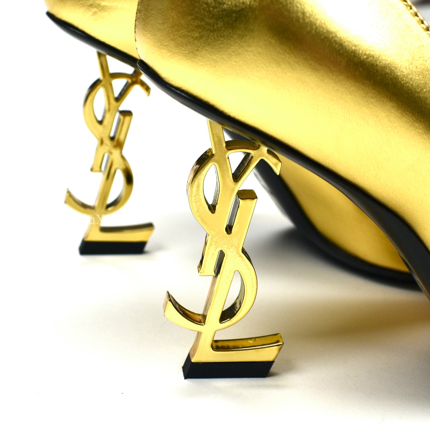 - Gold-tone metal YSL logo heel