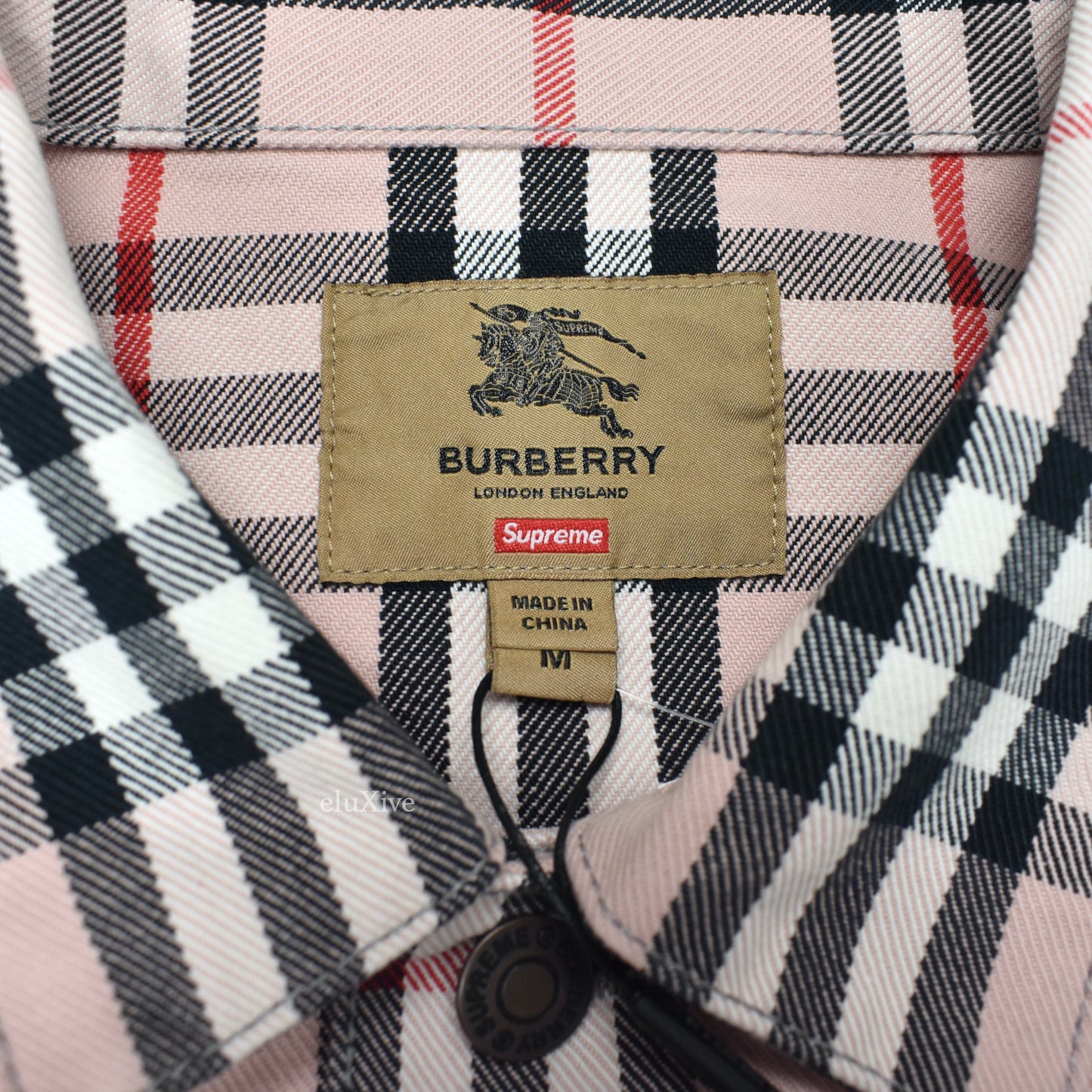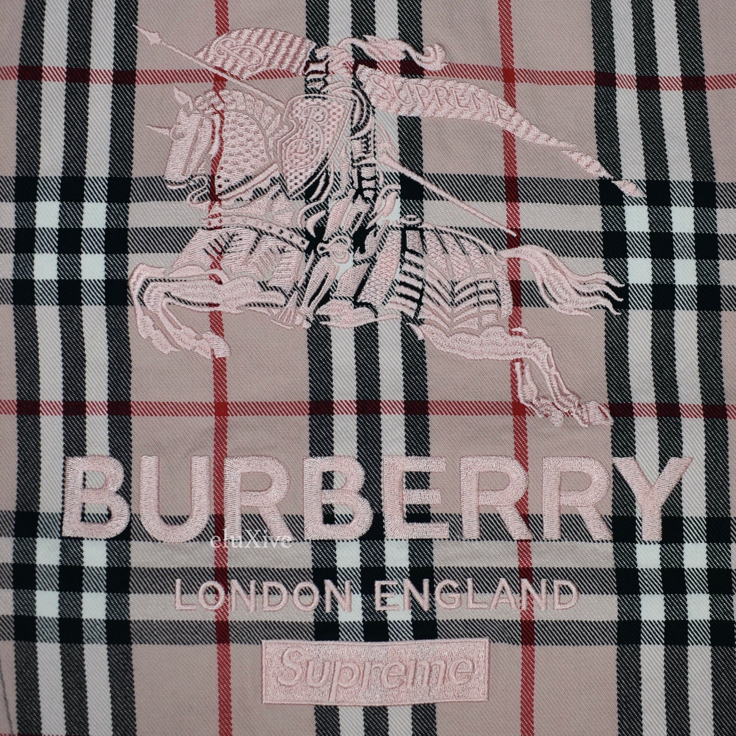 - Large, detailed Burberry and Supreme logos embroidered on back