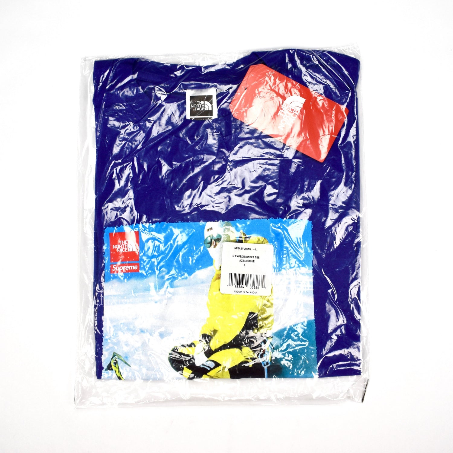 - Red Supreme box logo and North Face logo on front